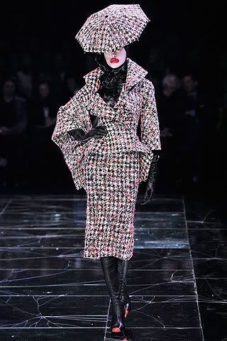 Fall/Winter 2009 RTW : This collection included a patchwork of references from his past collections as well as his predecessors as he took the Christian Dior plain Houndstooth print, and the classic Chanel tweed suit and made them his own. Philip Treacy once again supplied outrageous head-gear for the models as they appeared on the catwalk with half-comical, half-disturbing enormous black painted lips that some argued looked "ugly and misogynistic" while others were "energized by the couture-level drama" that he had brought to life in front of them. During points of the show, it seemed that Lee had become quite humorous in his approach as some of the garments looked to be constructed of trash bags with headgear consisting of aluminum cans wrapped in plastic. Lady Gaga chose to wear one of these creations for an editorial in a Japanese magazine.