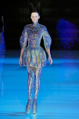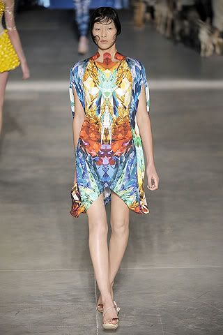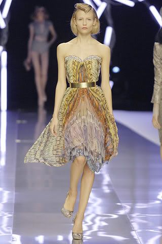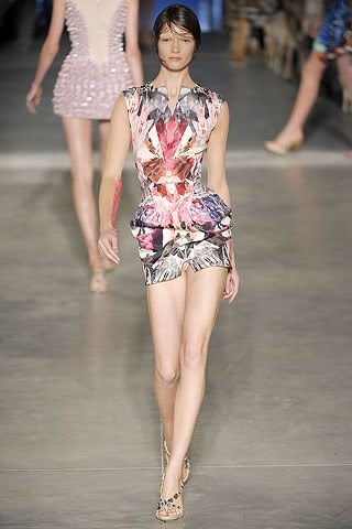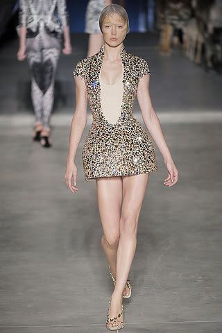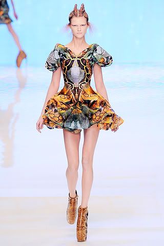 Spring/Summer 2009 RTW : Mcqueen ; the environmentalist was the story for this collection, the runway was surrounded by a zoo of stuffed endangered animals while a video projection of the earth revolving played above the heads' of the audience. It was very apparent that he was inspired by Charles Darwin's Theory Of Evolution as well as the destructive force of mans industrialization and the toll it's taking on the earth. The collection consisted mostly of graphic printed leggings, shifts, and more accessible shapes. The dresses took on a life of their own appearing to look like living organisms, some of the prints even resembling spinal chords and exoskeletons. (Another one of my favorites!)