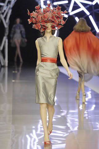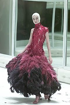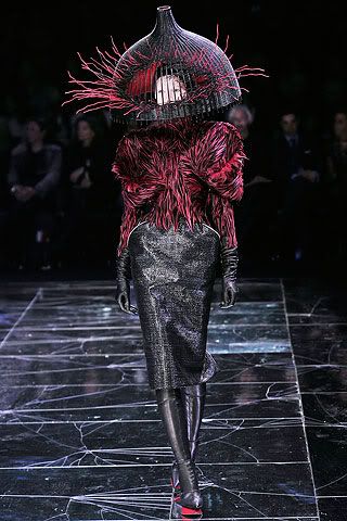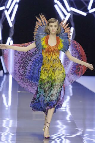 Spring/Summer 2008 RTW : This collection was a tribute to his late mentor and dear friend and icon Isabella Blow the very woman who discovered him, and purchased his entire graduate collection propelling his career from student rack to couture house. This collection also featured gorgeous Phillip Treacy headgear-in their most extreme manifestations. (A current favorite of Lady Gaga.) He referenced past collections including his Japanese-themed couture collection he designed for fashion house Givenchy. More bird influences were seen in his garments this time taking a more delicate side-instead of aggressive, bringing back the birds of paradise feathers and bright color palette.
