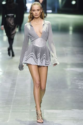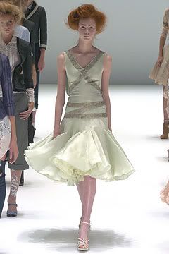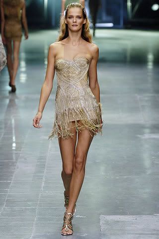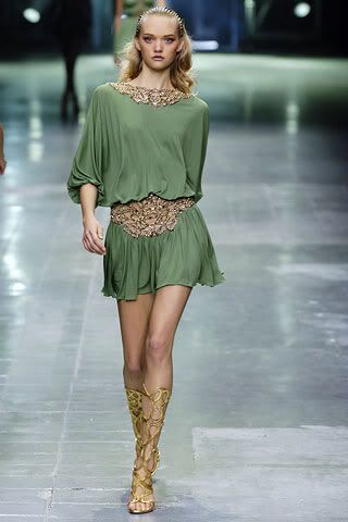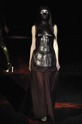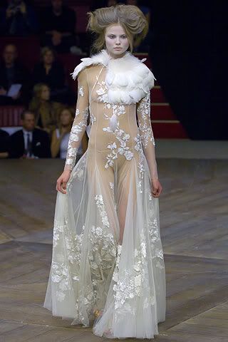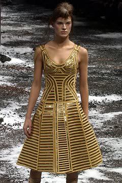 Spring/Summer 2006 RTW : Missing from the show once again were the over-produced theatrics that everyone has come to expect at a Mcqueen show. This time he had moved in a more everyday wearable direction. The shock value was still present as the women took the runway in sheer, thin, see-through silk and chiffon, and low-cut bust lines meant to leave little to the imagination. By now, Lee knew that his customers were daring, and unique women who loved to show skin and be a force to be reckoned with. The theme changed as the dresses took on a more Grecian-inspired twist as the models made their way down the runway in little dresses that suggested they would be a gentleman's favorite in ancient Greece. This is also the first and only few glimpses we had of swimwear introduced into his collections, as the models looked like they would be lounging pool-side on some far off planet, but sadly it was short-lived.