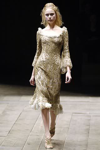 Spring/Summer 2007 RTW : An enormous dusty chandelier hangs high above a live orchestra placed in the middle of a circular runway. The models traversed down the runway in elaborate pieces that are meant to remind you of the romanticism of days past. The floral gowns were exceptionally executed and are prime examples of his ready-to-wear with couture sensability skills. A shear lace applique dress from this collection once again inspired Lady Gaga who wore something very similar for appearances and performances. There were also more modern-day wearable pieces that stood-out to the critics and spectators which in return, made this one of his best collections to date. (And one of my all-time favorites, it's exceptionally hard to pick just 4.)