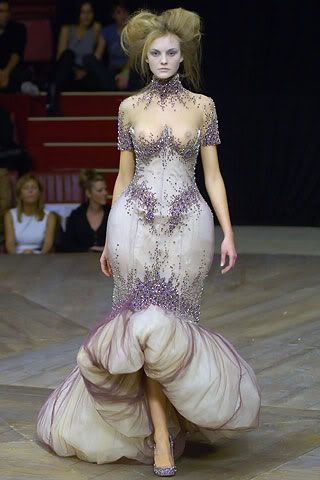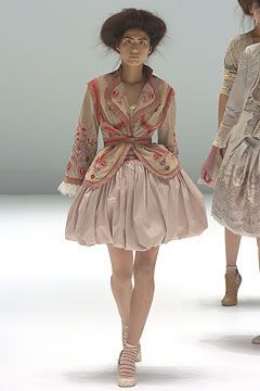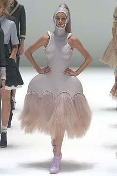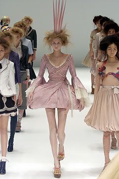 Spring/Summer 2005 RTW : The models stand still, positioned strategically on his giant chessboard. He chose his most popular silhouettes reworked in ways that made them seem almost brand new to the eye.. well, because they were. He reinvented what he already had executed so well. He revisited his past collections including the Russian influence of his Fall 2003 RTW collection adding more of a child-like feel with carousel print skirts, his Spring/Summer 2000 RTW collection which included rigid molded corsets made to resemble a full-body cast referencing his hospital/asylum theme this time adding wig elements to the bottom of the pronounced structure of the skirt. His popular crisscross bodice from the previous Fall/Winter 2004 collection returned this time replaced with a younger, flouncier, more whimsical tulle puff above-the-knee skirt. The same basic concepts, but with a totally different appeal.