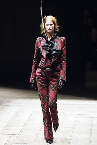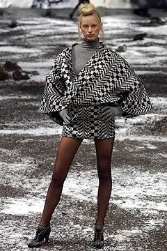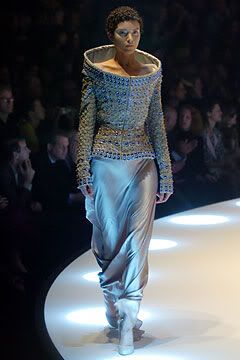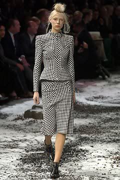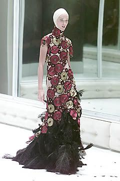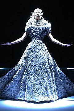 Fall 2003 RTW : A large glass wind tunnel on the edge of a frozen tundra.. Sound odd? Not to Alexander Mcqueen. "I wanted it to be like a nomadic journey across the tundra." He stated. And it was just that as the models walked down the runway in heavily east-meets-west influenced garments including gorgeous fur coats that made the women look like Russian dolls making there way through a blizzard. The mood quickly changes to a more barbaric almost war-stricken time, the women now wearing heavy metal plated gowns insinuating they were in the midst of a battle for their lives as they all looked almost samurai-esque. This is also one of the first appearances of one of Lee's all-time favorite prints that will forever remind the public of him, Houndstooth. The show ends with a model walking through the wind tunnel in a skin-tight leather bodysuit dragging a 20-foot-kimono-like parachute into the eye of the snowstorm.