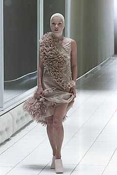 Fall 2004 RTW: When the audience started to file-in to the London venue for his Fall 2004 RTW collection they were met, to their surprise, with a plain white runway. Where were the theatrics? The projections? The scenery? The provocative runway appeal that he was now known for was missing. A rebirth of the Mcqueen label? That was exactly what his intention was, to strip away all the over-produced, intense, presentation and to just "focus purely on design." The women somberly took the runway in a muted color palette mostly made up of jersey and silk. One of Mcqueens most-well-known gowns was from this collection the simple, yet stunning silhouette of this floor-sweeping Grecian-style gown with crisscross bodice quickly became a celebrity-favorite and has been reworked many times. As the collection moved from day to eveningwear the tone dramatically changed to conceptually futuristic. Unlike his other shows, the shock value lied purely in the designs as the women looked like Tudor-esque alien queens from the 23rd century.
