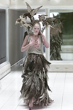 'Birds' Spring/Summer 2001 RTW : The audience is seated around a large mirrored box meant to evoke the twisted and troubled setting of a mental asylum, the models walk in circles inside trying to reach out to the audience from inside the glass cube that imprisons each of them. Most of them are covered in bandages and suggestive nurses wear. Added to the eerie scene are taxidermy birds meant to look like they are swooping down and attacking the beautiful models à la Hitchcock.