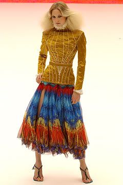 Spring/Summer 2003 RTW : Underwater scenes are projected in a Blair Witch-like forest atmosphere. Pirates, and drowned maidens make their way down the catwalk as if they had been shipwrecked on a far-off island away from civilization. The aestethic quickly changes as it becomes evident that the rainforest was a large inspiration of this collection as the toned down browns, mauves, cremes, and gauzy-like gowns turn into birds of paradise colored flouncy chiffon skirts under gender-bending impeccably tailored almost Shakespearean jackets.
