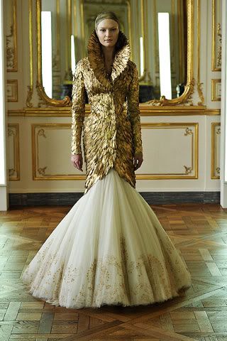 Fall/Winter 2007 RTW : The theme of witchcraft came to life on the runway as the models stomped around a pentagram traced in red inside a black-sand circle, with an inverted pyramid hanging high above. The show starts, a macabre film- of naked women, decaying skulls, swarming locusts, and blood and fire plays above the models' heads. The inspiration behind this collection spurred from Mcqueen discovering that his mother's bloodline dated as far back as the Salem witch-hunts of the 17th century, and that one of her ancestors was actually prosecuted. The themes of paganism, religious prosecution, witchcraft, and hell played on the dark and angry side of Lee's creativity. Making a return appearance are his full-body casts this time rendered in chocolate brown made to look as if the models have been encased in bark, trapped forever. He also referenced links between ancient Egypt and folk culture in the early British New World which can be seen in his golden statuette almost sarcophagi looking bodysuit that was most recently seen on Lady Gaga in a promo image for her second album, The Fame Monster. (Another one of my all-time favorite collections!)